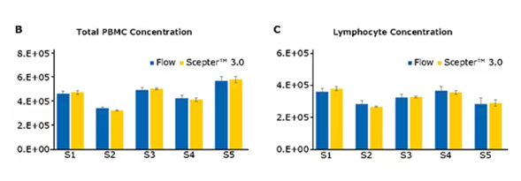 使用Scepter 3.0 手持細胞計數系統,透過 gating 功能算出的各群數量,與流式細胞儀相比,兩者計數出的 Total PBMC 和 lymphocyte 數量大致相同,但 Scepter 3.0 無需染色、等候上機,且計數僅需 30 秒可得到結果。